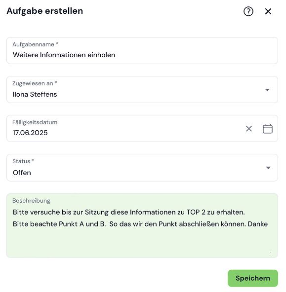 Aufgaben können direkt pro Tagesordnungspunkt oder global angelegt, delegiert und nachverfolgt werden.